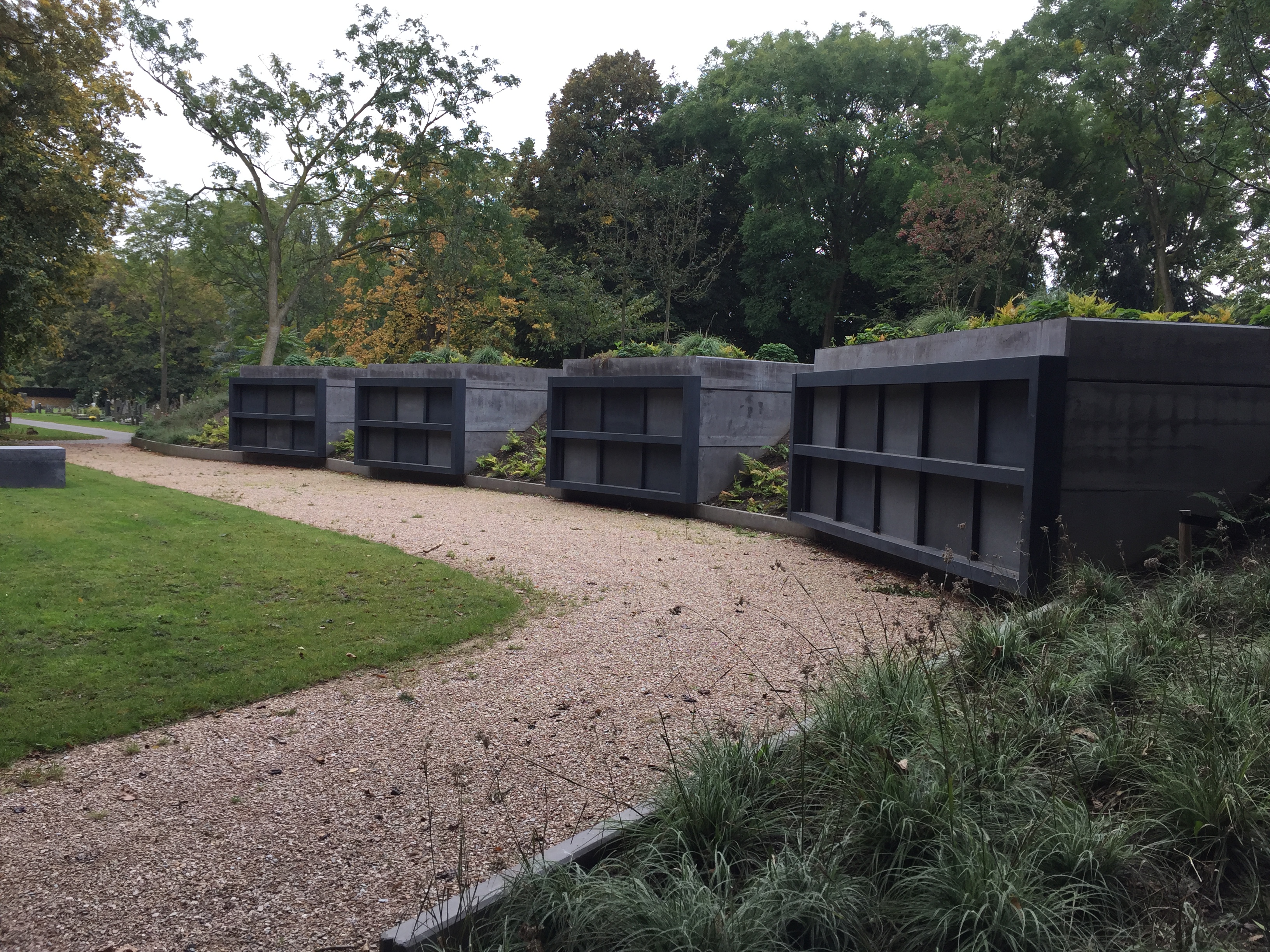 De natuurstenen afsluitplaten variëren in kleur door te kiezen voor verschillende bewerkingen. Bijzonder is ook dat met deze wandgraven een landschappelijke verbinding is ontstaan tussen heden en verleden. Ze zijn gesitueerd in de aarden wal die de grens markeert met het opgehoogde deel van de begraafplaats waar zich het nieuwe Kinderhof bevindt. Met nieuwe (rolstoelvriendelijke) paden is het oude gedeelte nu ontsloten en is de begraafplaats als geheel weer een groene wandelroute rijker. Wethouder Pieter Heijkoop heropende de Rijksmonumentale grafvelden op begraafplaats De Essenhof.