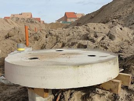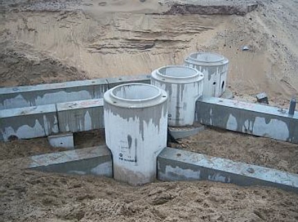 Plaats de bodemplaten (ø 1600 of ø 1800 mm) op de juiste hoogte boven de palen. De onderzijde van de bodemplaat moet 150 mm onder de theoretische paalhoogte geplaatst worden. Tip: door het zandbed 150 mm lager af te werken dan de theoretische hoogte van de paalkop kan de bodemplaat op het zandbed geplaatst worden. Bodemplaten zijn standaard voorzien van 1 kogelkop hijsanker van 5 t.