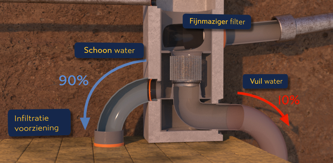 Deze infiltratievoorziening krijgt dan schoon water aangevoerd en gaat niet meer dicht slippen. Het vuil wordt afgevoerd met een klein gedeelte van het water naar de vuilwaterafvoer.